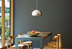 De hanglamp komt goed tot zijn recht boven de eettafel, waar hij een prachtige uitstraling geeft. Voor meer volume in de ruimte kunnen er meerdere naast elkaar worden gehangen.
