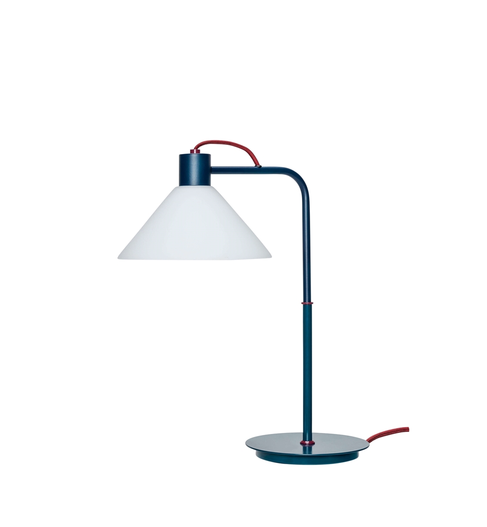 De tafellamp Spot combineert klassieke functionaliteit met een moderne uitstraling en zal met zijn elegante design elke inrichting verfraaien. De lamp heeft een harmonieuze en levendige uitstraling met een petroleumblauwe basis, witte glazen kap en rode snoer. Het ontwerp voegt warmte en sfeer toe aan de ruimte, of de lamp nu op een bureau, een plank of een schap wordt geplaatst.