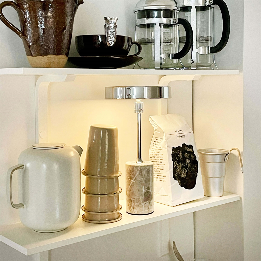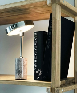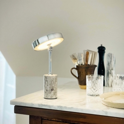 De oplaadbare batterijlamp Starlight LED heeft een slank ontwerp in chroom gecombineerd met een stevige marmeren basis, wat de tafellamp een elegant en exclusief uiterlijk geeft. De geïntegreerde LED-lichtbron is dimbaar in drie stappen van 100%, 60% en 20%, zodat de lichtsterkte kan worden aangepast aan de situatie. Tegelijkertijd kan de kap worden gekanteld, wat flexibiliteit biedt bij het aanpassen van de lichtinval, of je nu aan je bureau werkt of een gezellige verlichting in de woonkamer creëert.