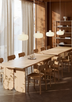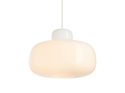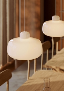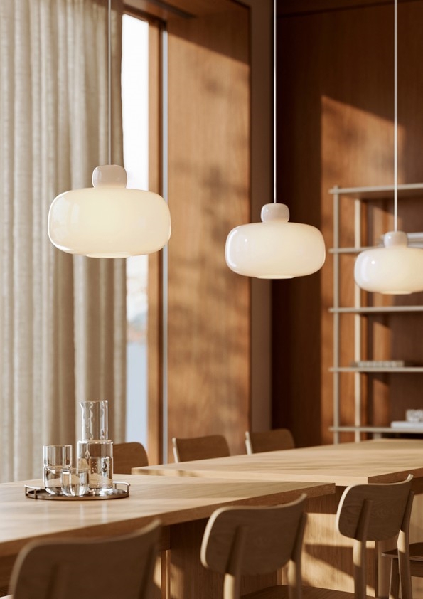 Deze melkwitte Stone hanglamp in triplex opaalglas is geïntroduceerd in 2026 en heeft een elegante, langgerekte silhouet, als nieuwe toevoeging aan de Stone-serie. Er is ook een kleine hanglamp in triplex opaalglas geïntroduceerd met de bekende Stone-vorm. Beide worden geleverd