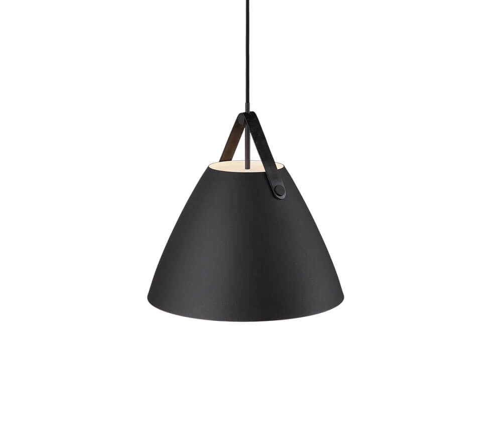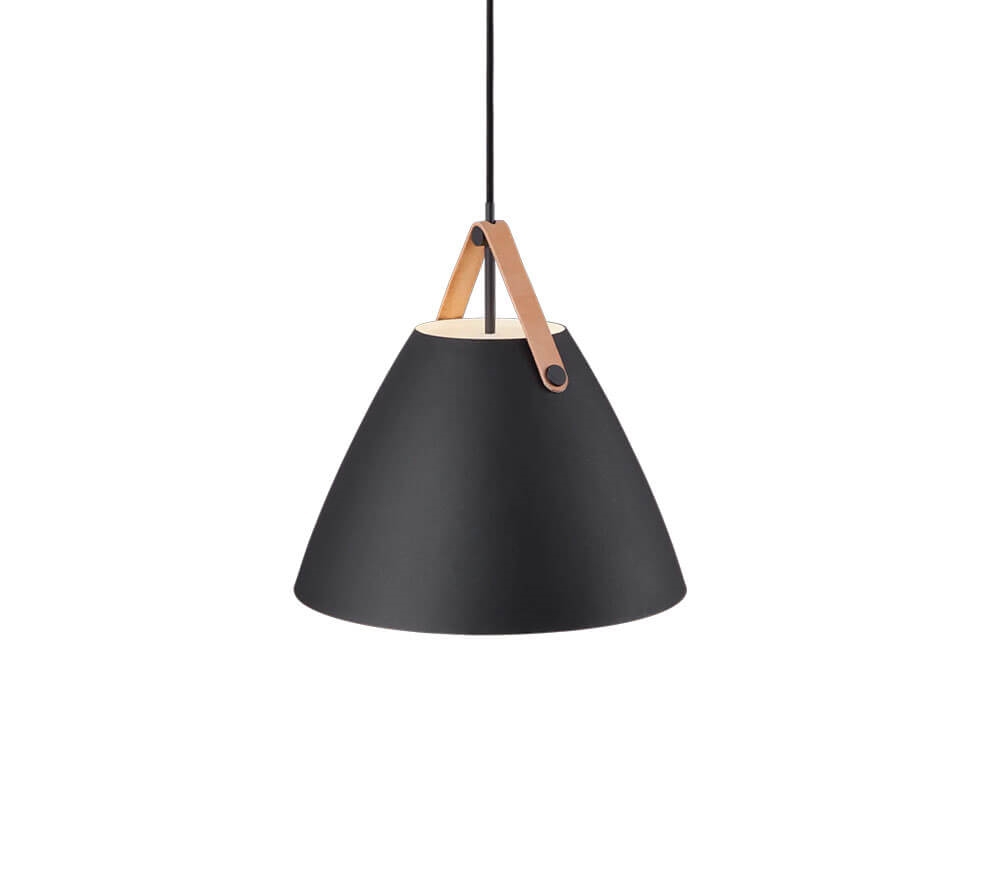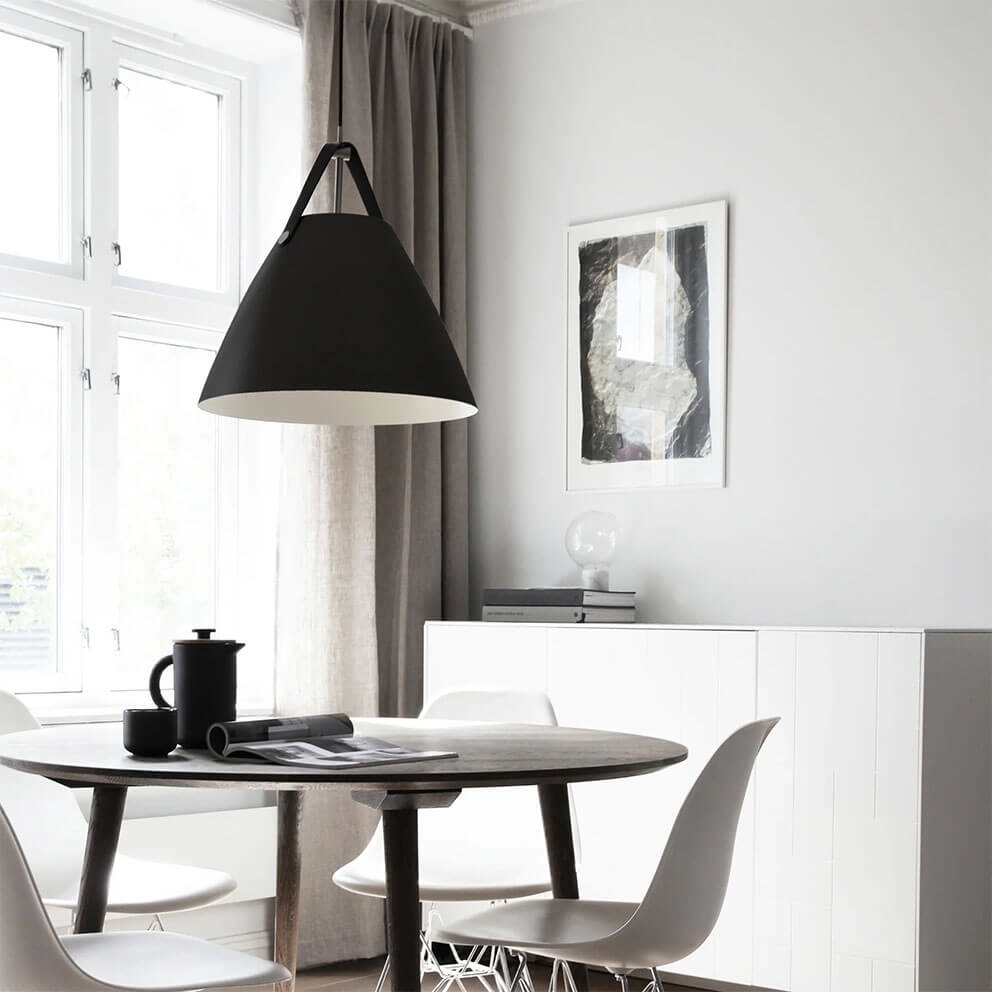 De hanglamp Strap 36 combineert metaal en leer in een moderne Scandinavische stijl. De Strap-serie ontleent zijn naam aan de opvallende riemen die warmte en een ruwe uitstraling aan de lamp toevoegen. Het ontwerp balanceert tussen een klassieke en industriële uitstraling.