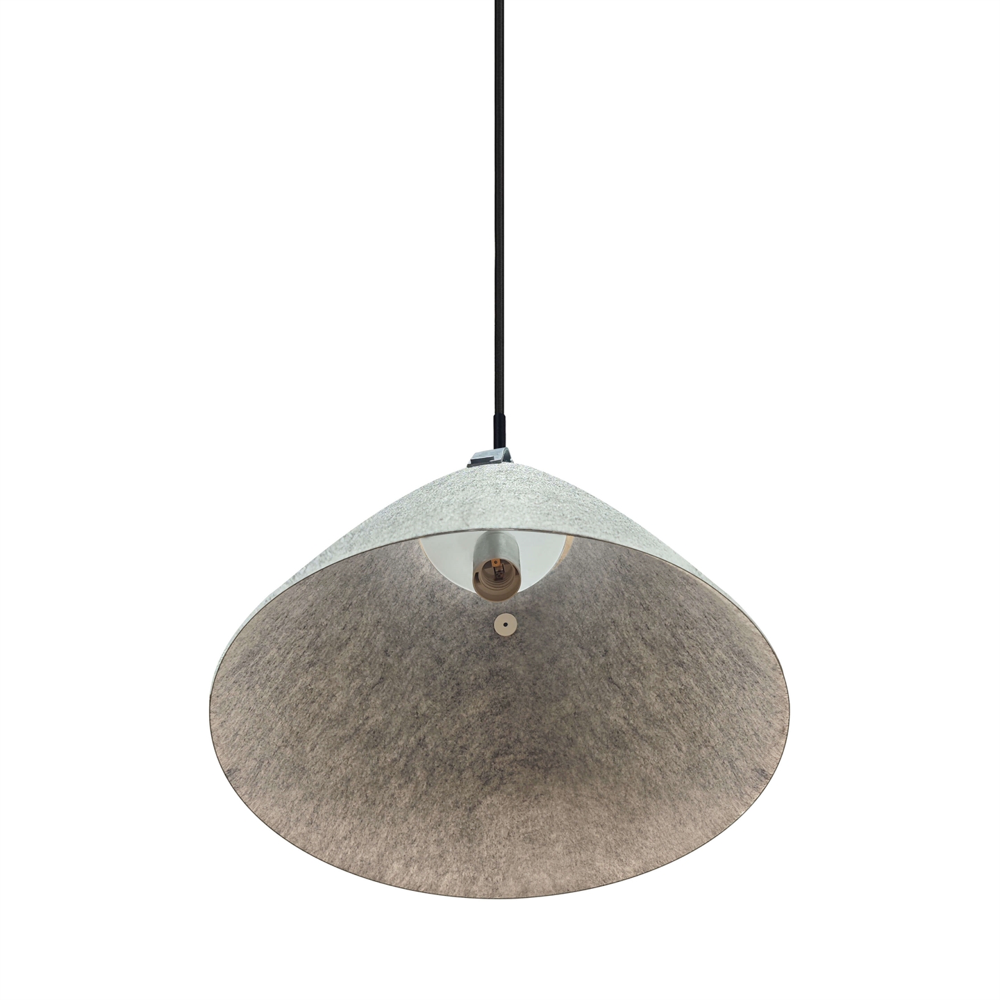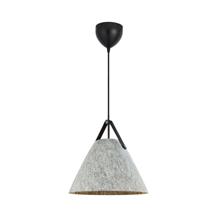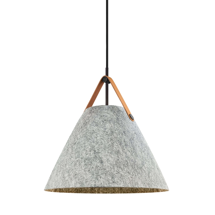 De hanglamp Strap 36 in lichtgrijs combineert vilt, metaal en leer in een moderne Scandinavische stijl. De Strap-serie ontleent zijn naam aan de opvallende riemen die warmte en een ruwe uitstraling aan de lamp toevoegen. Het ontwerp balanceert tussen een klassieke en industriële uitstraling.