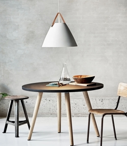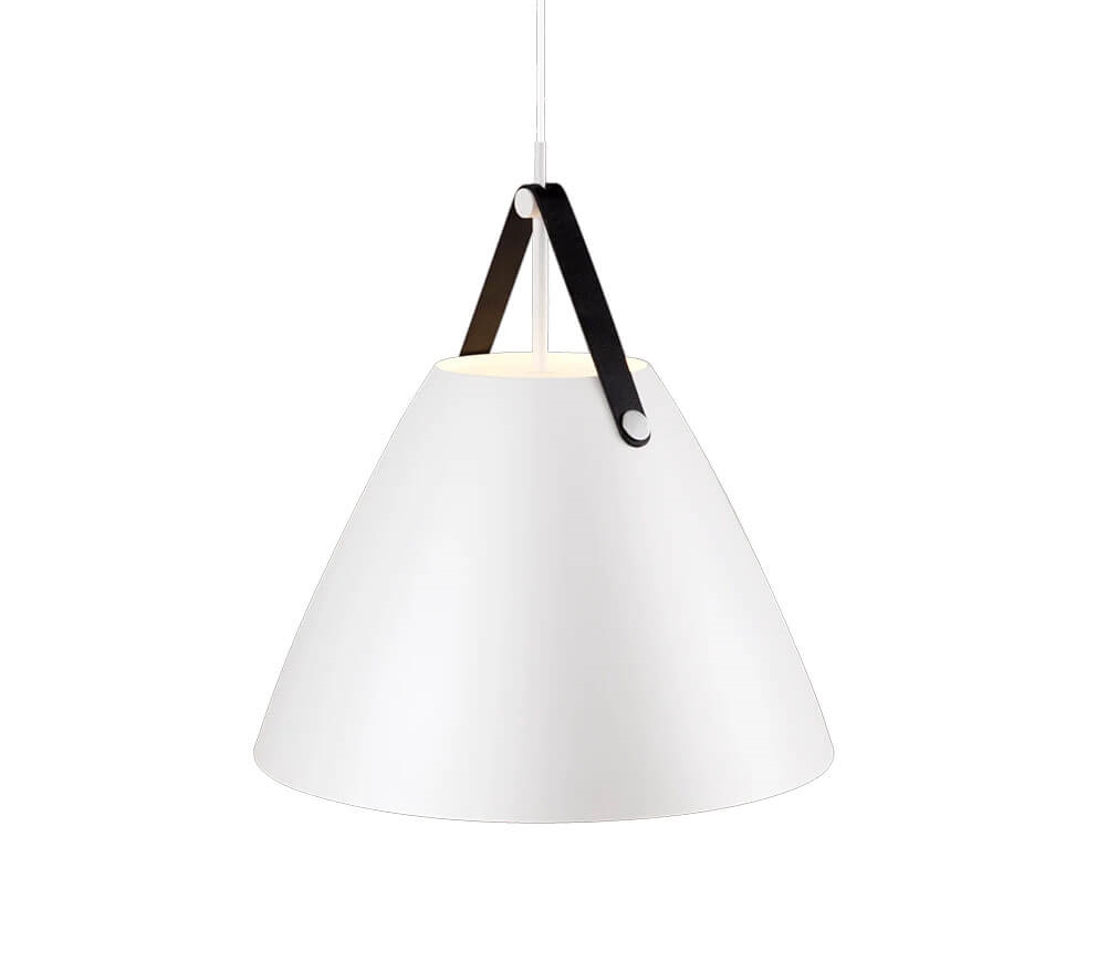 De hanglamp Strap 48 combineert metaal en leer in een moderne Scandinavische stijl. De Strap-serie dankt zijn naam aan de opvallende riemen die warmte en een ruwe uitstraling aan de lamp toevoegen. Het ontwerp balanceert tussen een klassieke en industriële uitstraling.