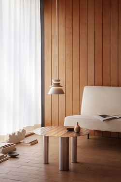 De iconische hanglamp Sundowner ontworpen door Jørn Utzon in 1948 met schermen in grijs-beige met roze ondertonen en mat wit creëert een aangename en sfeervolle verlichting bij zonsondergang. Wanneer de lamp aan is, doet de horizontale middenlijn denken aan de laatste zonnestralen.