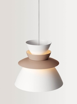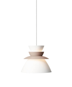 De iconische hanglamp Sundowner, ontworpen door Jørn Utzon in 1948, met grijs-beige schermen met roze ondertonen en mat wit, creëert een aangename en sfeervolle verlichting bij zonsondergang. Wanneer de lamp aan is, doet de horizontale middenlijn denken aan de laatste zonnestralen.