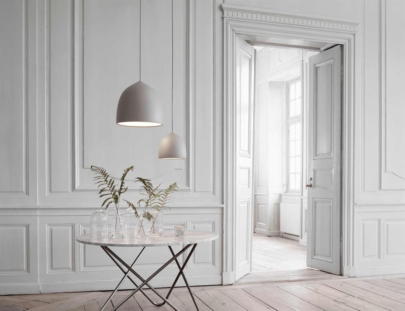 De Suspence hanglamp heeft een opale afscherming die het licht concentreert, verblinding voorkomt en een elegant optisch bedrog creëert.