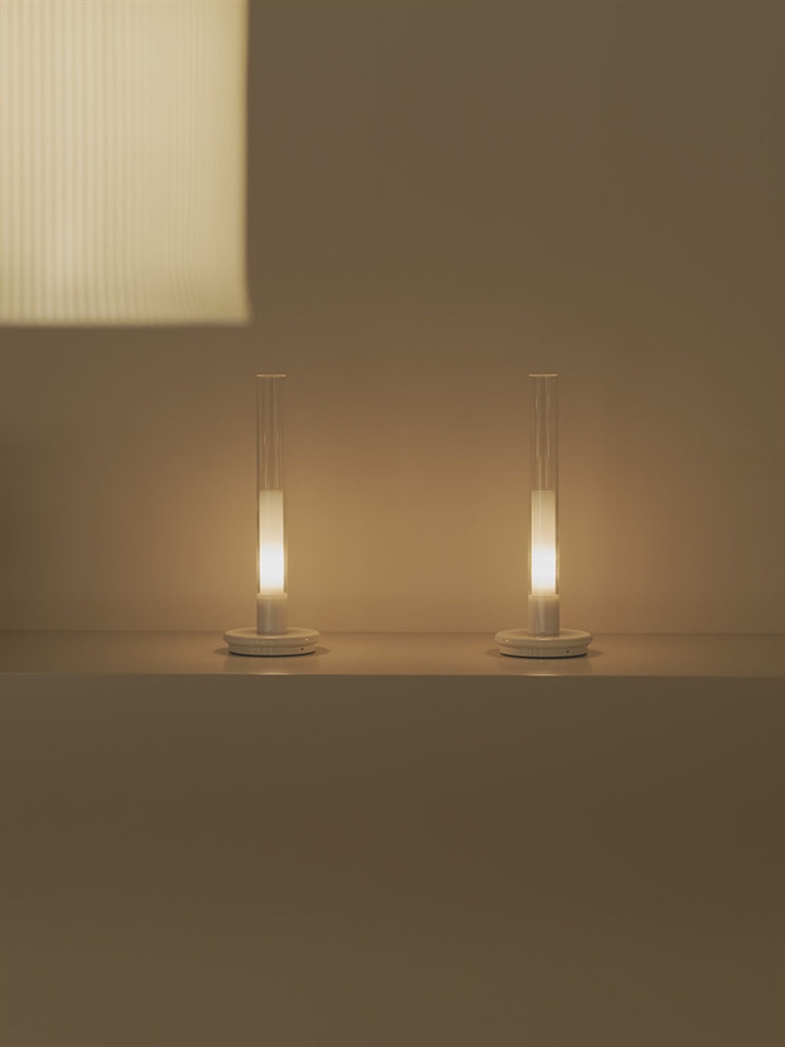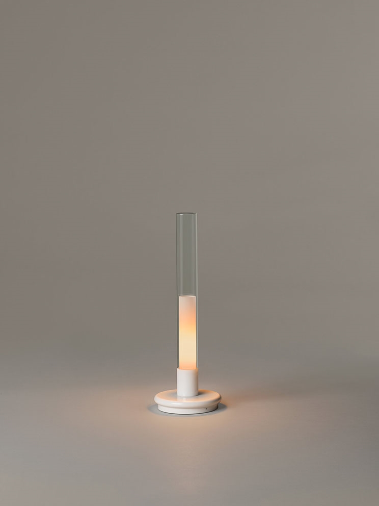 De kap is gemaakt van transparant Pyrex glas en de metalen basis is glanzend wit. De schakelaar bevindt zich op de lamp, die 2 lichtniveaus heeft. Op de hoogste stand brandt hij 7 uur en op de laagste stand 14 uur. Een volledige oplading duurt 5 uur.
