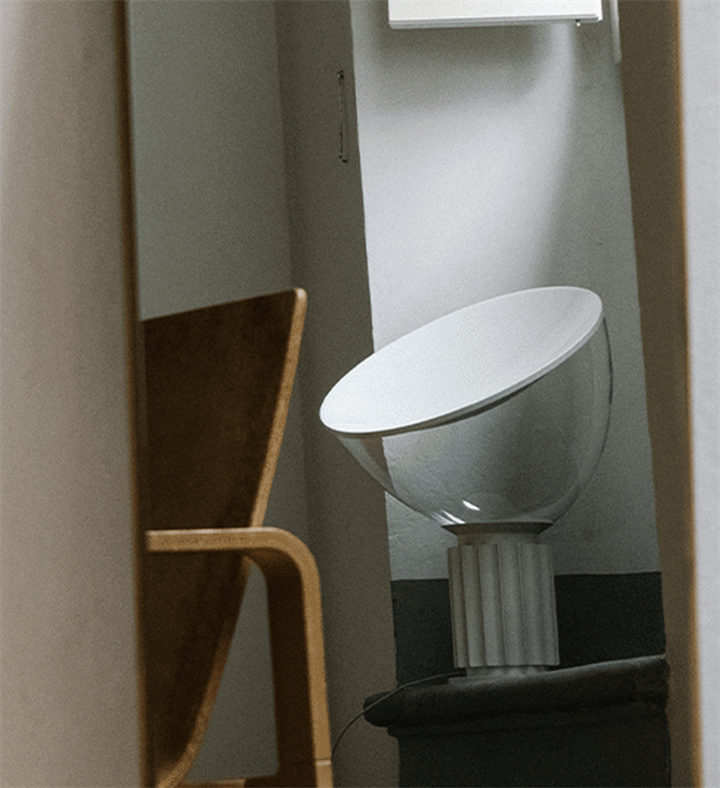 Taccia kenmerkt zich door zijn unieke constructie met een geribbelde basis en een komvormige glazen kap die lichtjes bovenop balanceert en het licht naar boven reflecteert. Het resultaat is een zacht en indirect licht dat een aangename en sfeervolle atmosfeer in de ruimte creëert.