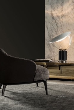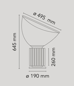 Taccia kenmerkt zich door zijn unieke constructie met een geribbelde basis en een komvormige glazen kap die lichtjes bovenop balanceert en het licht naar boven reflecteert. Het resultaat is een zacht en indirect licht dat een aangename en sfeervolle atmosfeer in de ruimte creëert.