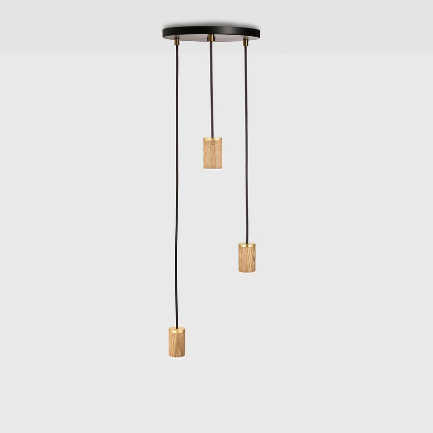 Tala Triple hanglamp is verkrijgbaar met een witte of zwarte plafondbaldakijn, met bijpassende grepen in zwart, messing, grafiet en eiken.