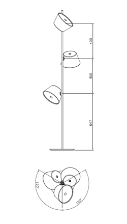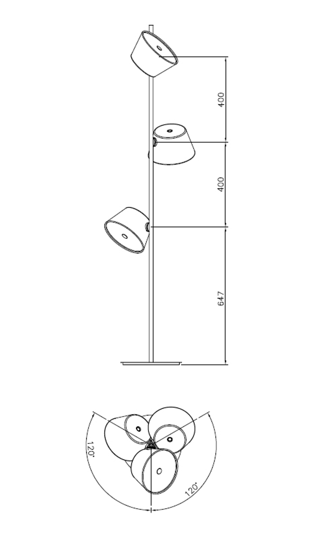 De vloerlamp heeft een zwart frame en drie zwarte kappen langs het frame. De kappen kunnen 360° worden gedraaid, waardoor het mogelijk is het licht aan te passen aan alle behoeften.
