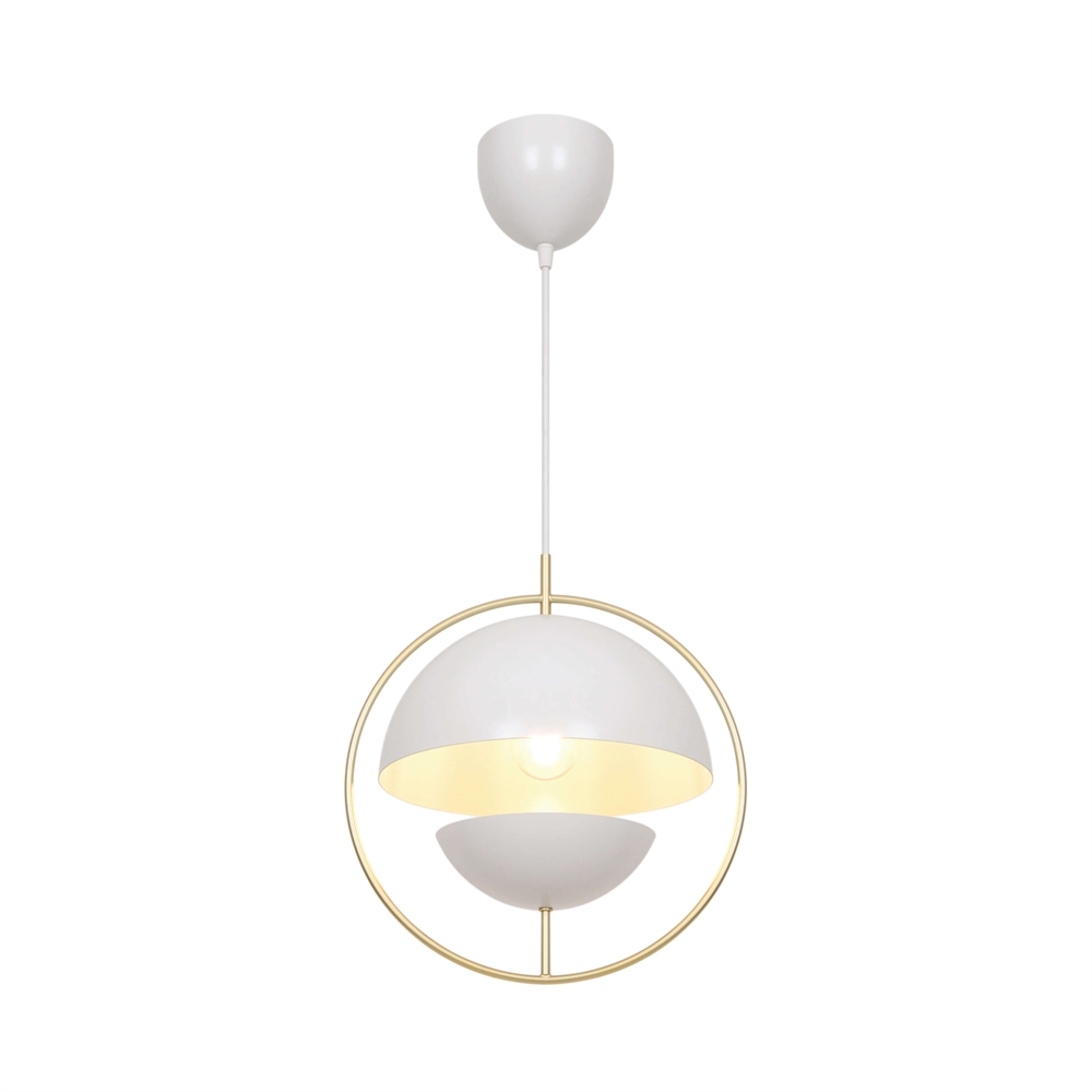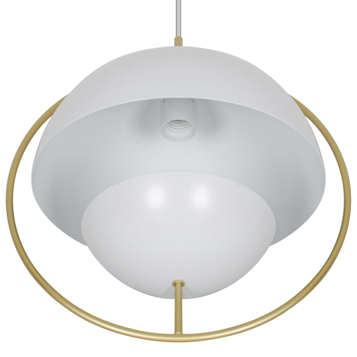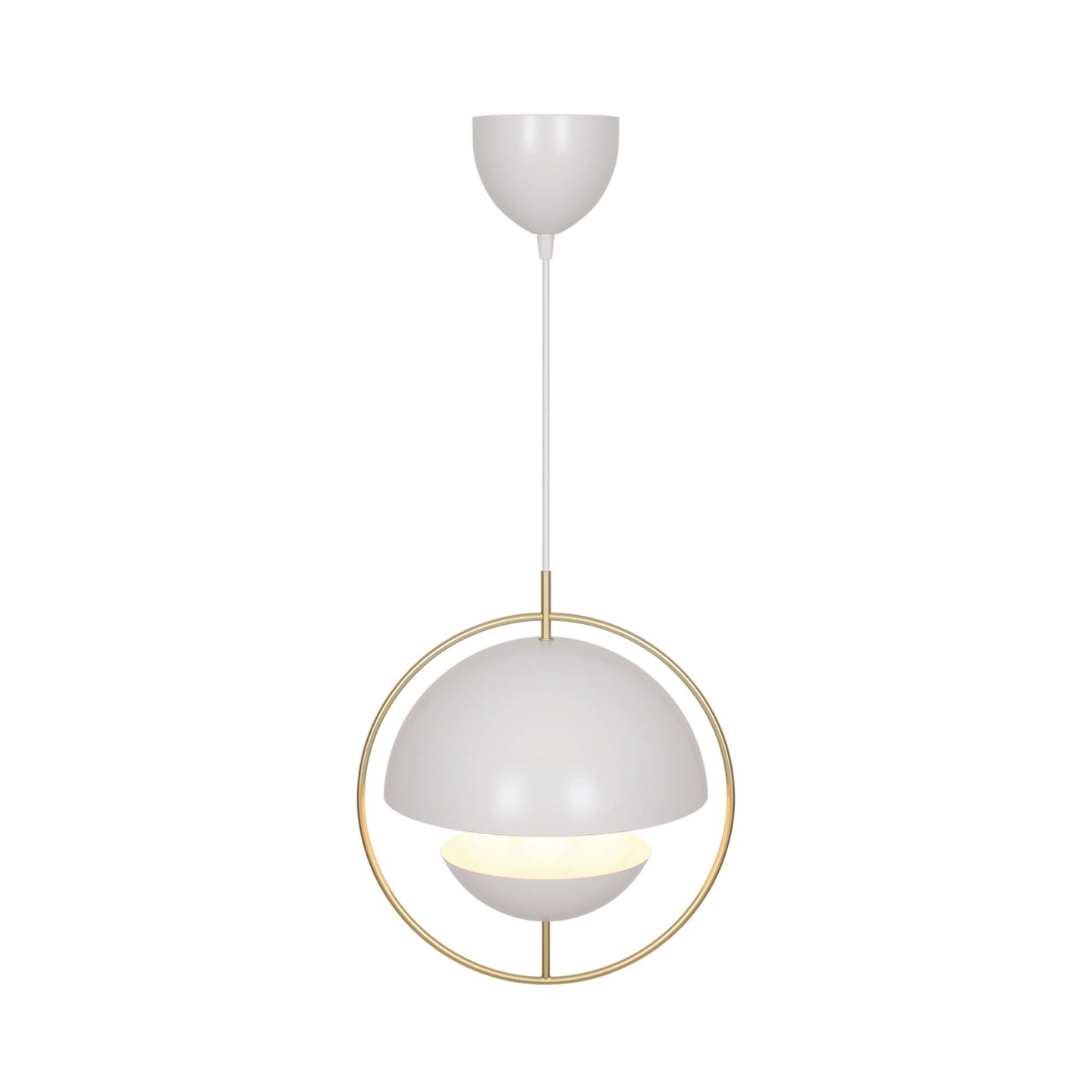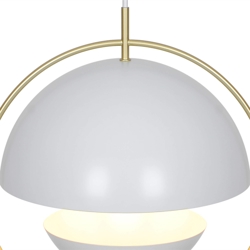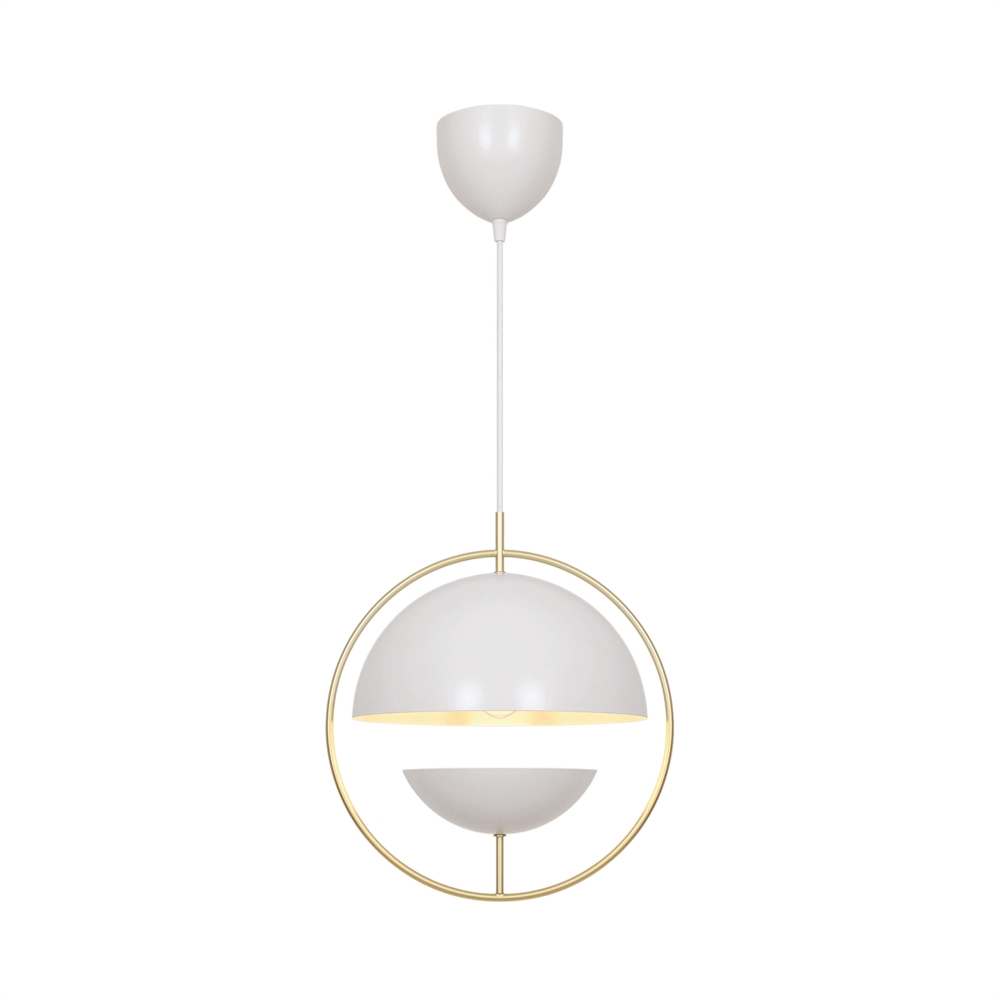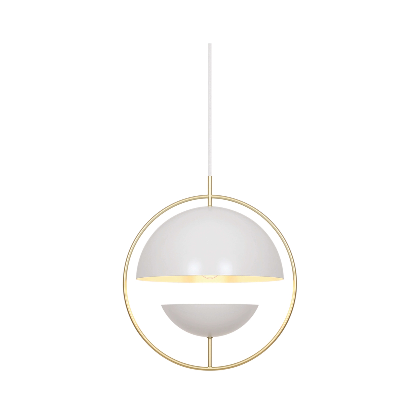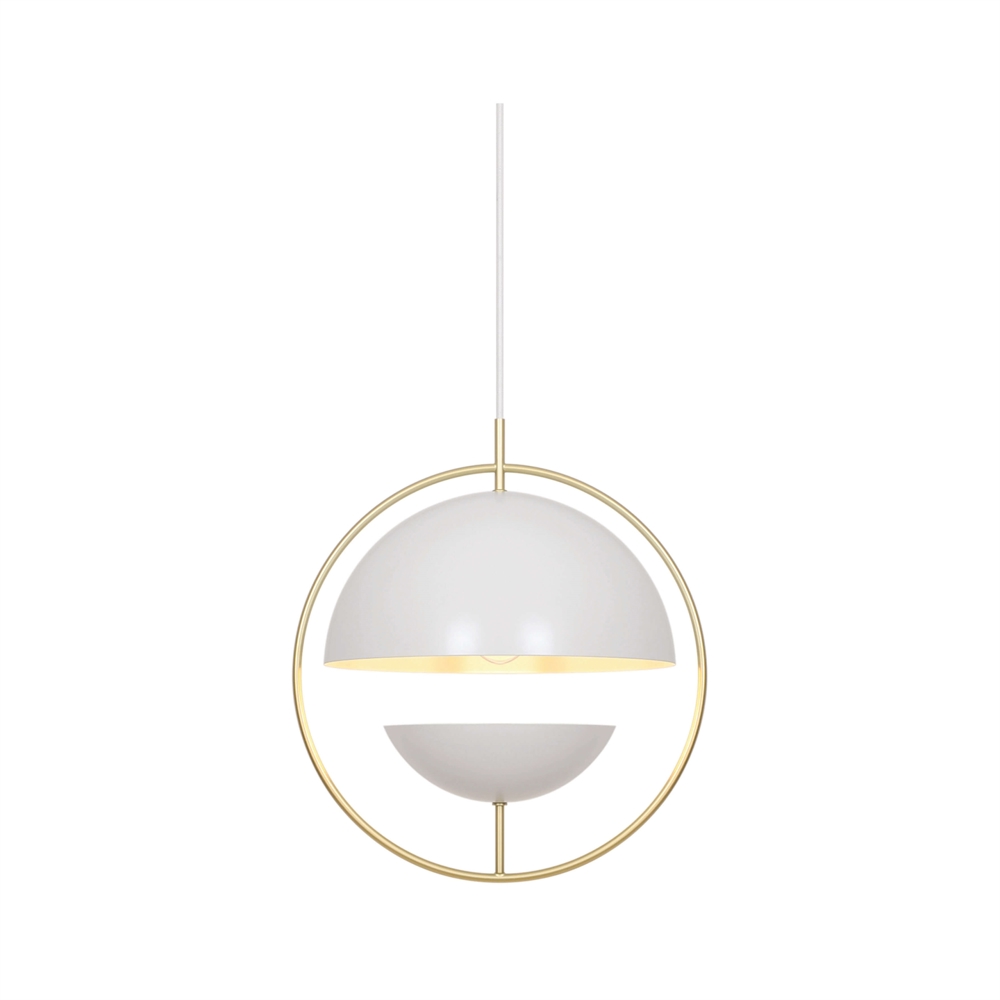 Tavia is een decoratieve hanglamp met een minimalistisch design en glamoureuze uitstraling. De twee halve matte witte kappen zijn omgeven door een elegante ring van glanzend messing en zorgen voor een aangenaam licht.