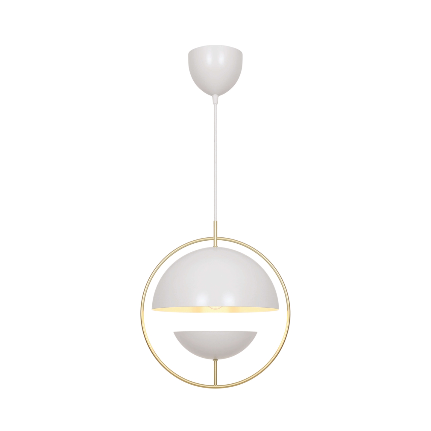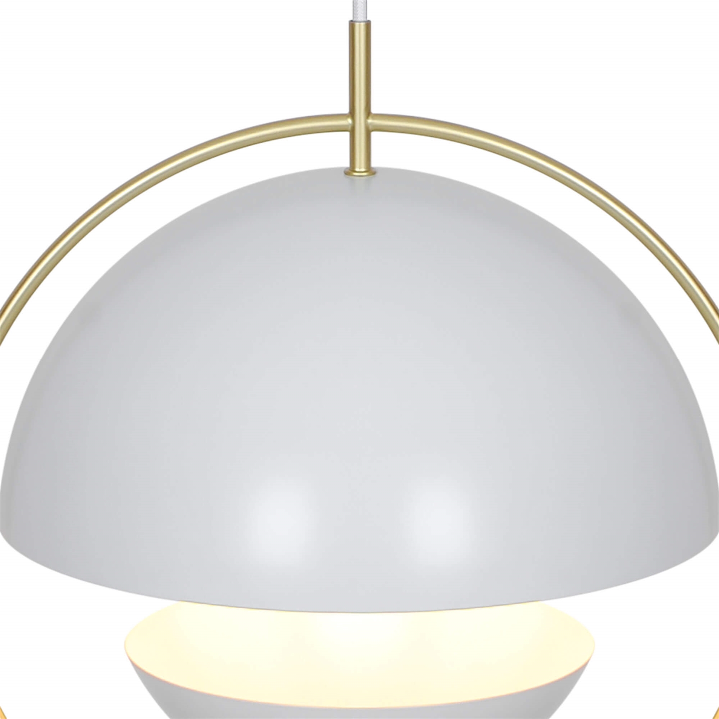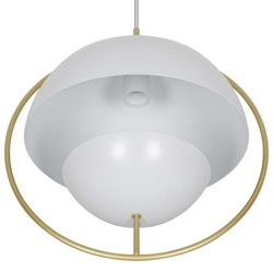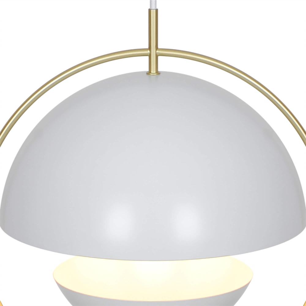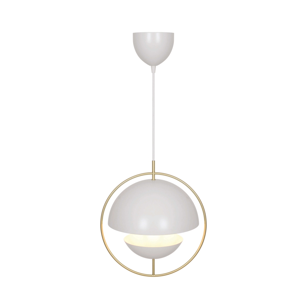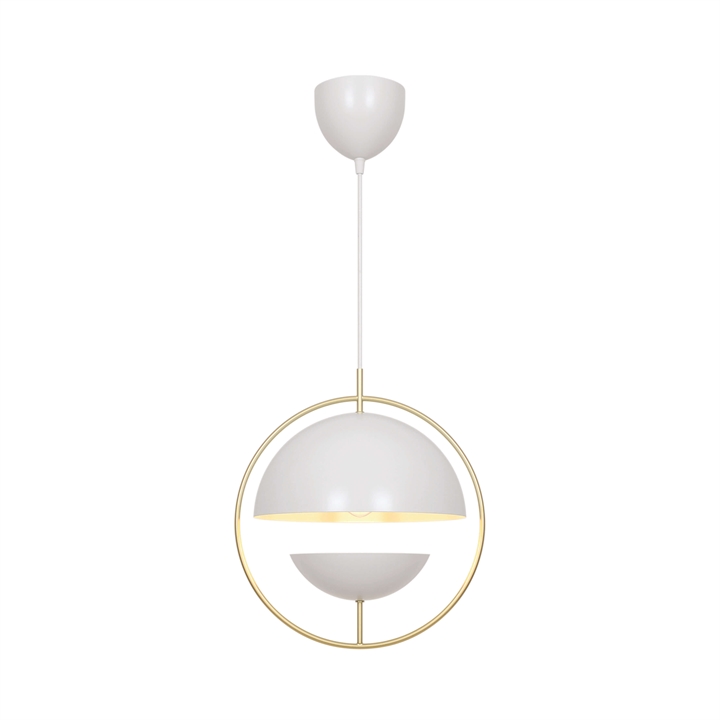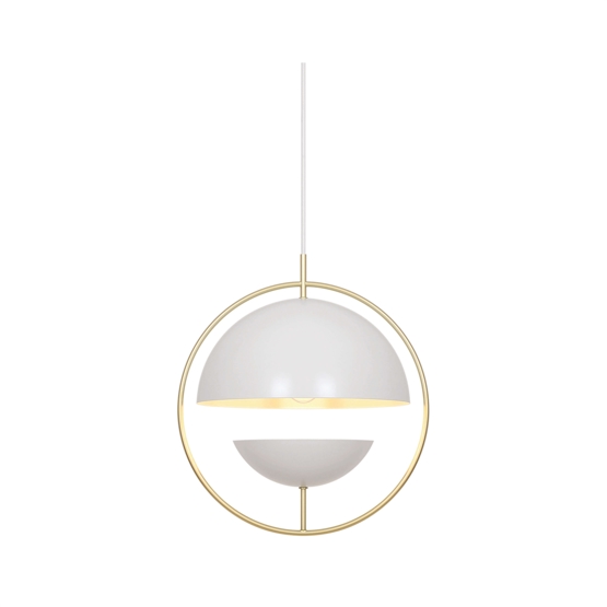 Tavia is een decoratieve hanglamp met een minimalistisch design en glamoureuze uitstraling. De twee halve matte witte kappen zijn omgeven door een elegante ring van glanzend messing en zorgen voor een aangenaam licht.