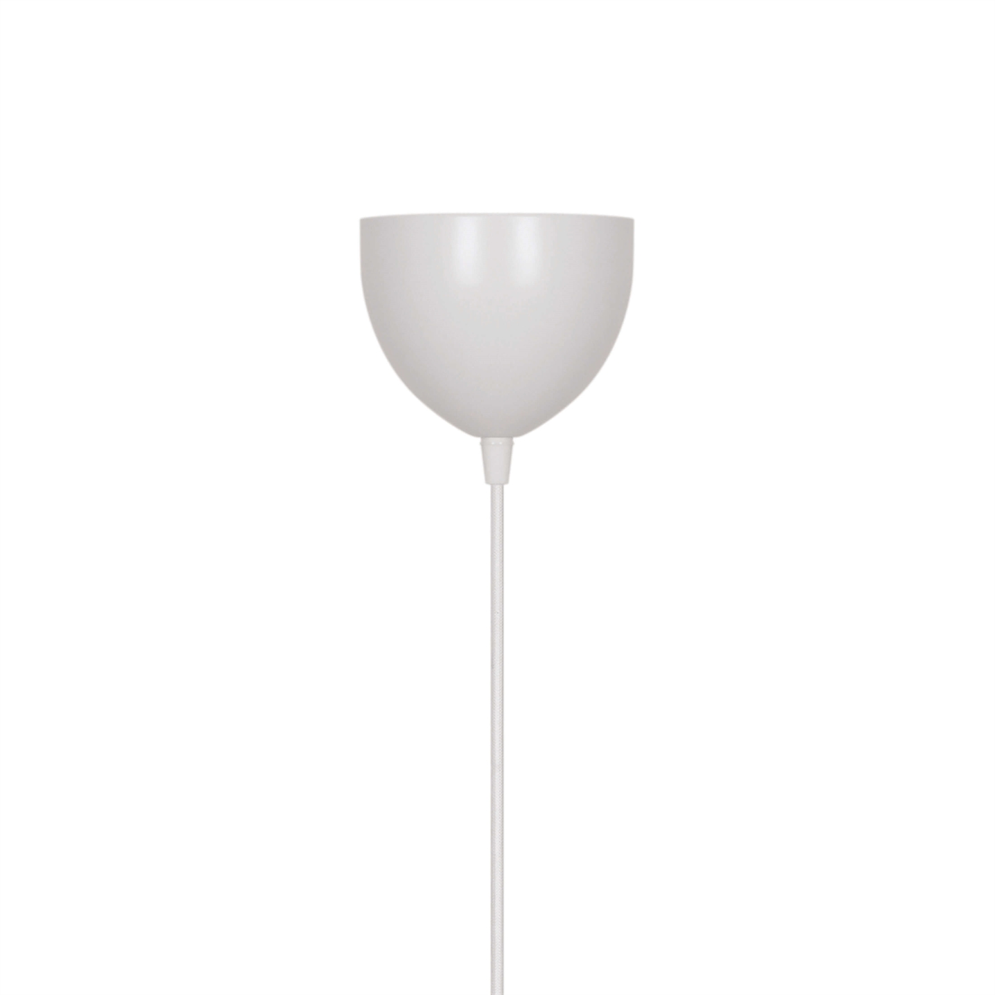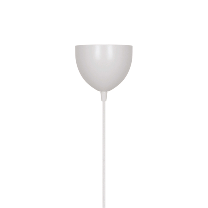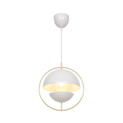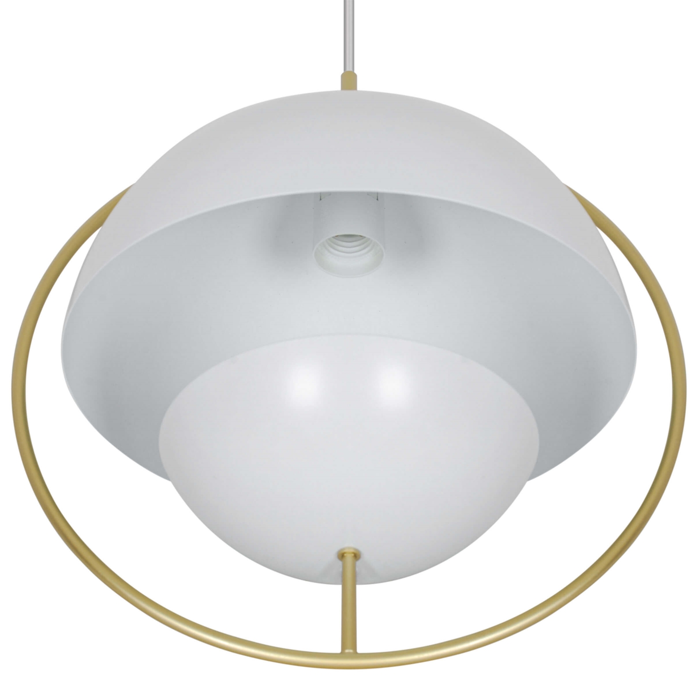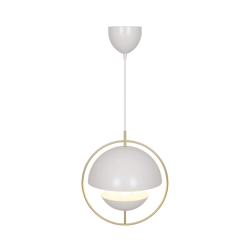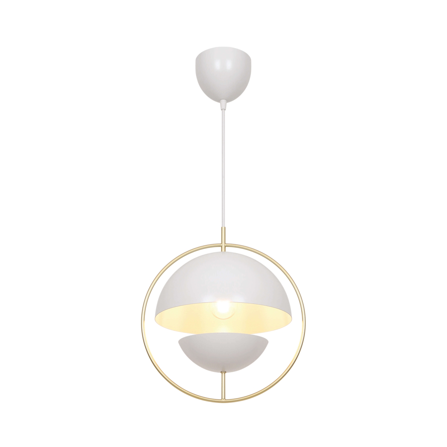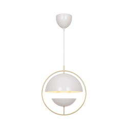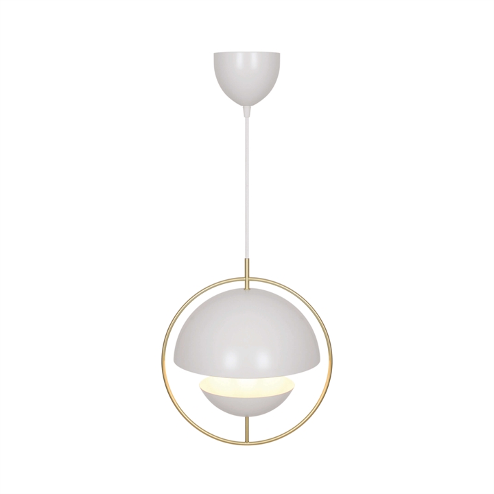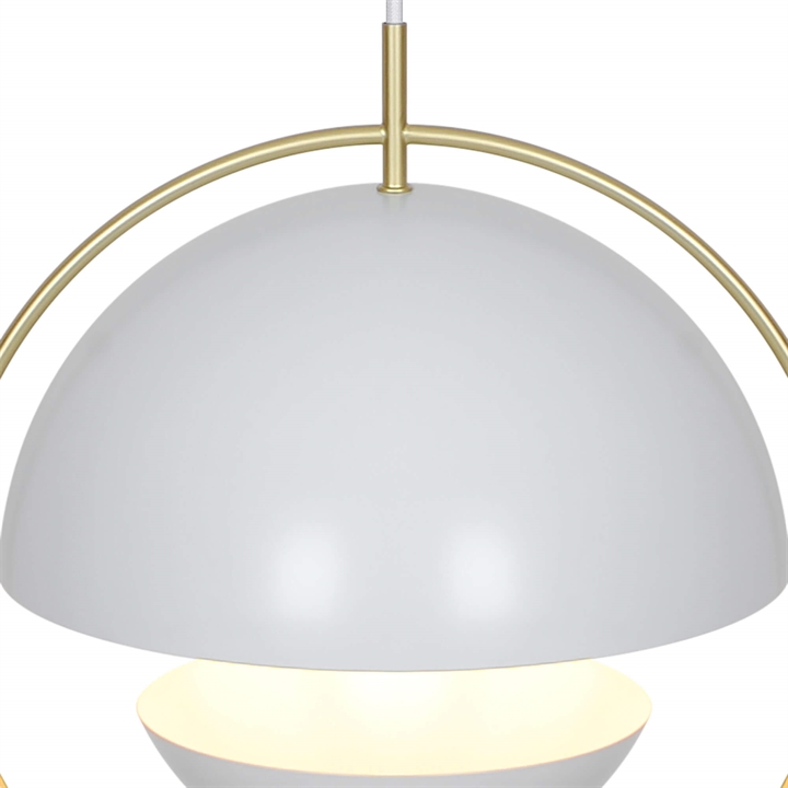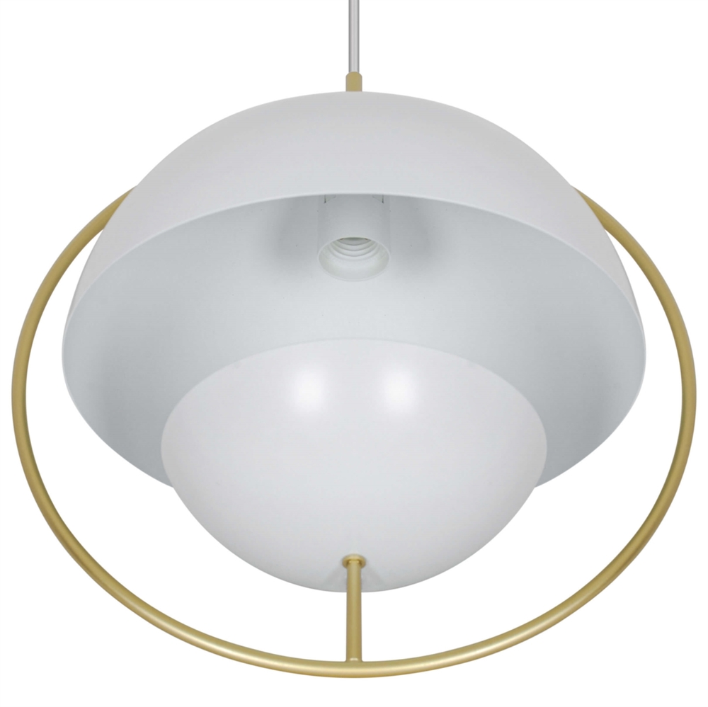 Tavia is een decoratieve hanglamp met een minimalistisch design en glamoureuze uitstraling. De twee halve matte witte kappen zijn omgeven door een elegante ring van glanzend messing en zorgen voor een aangenaam licht.