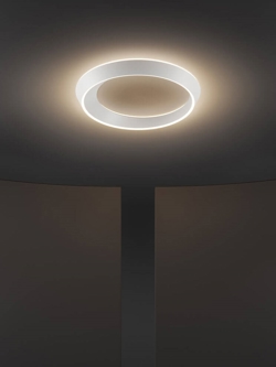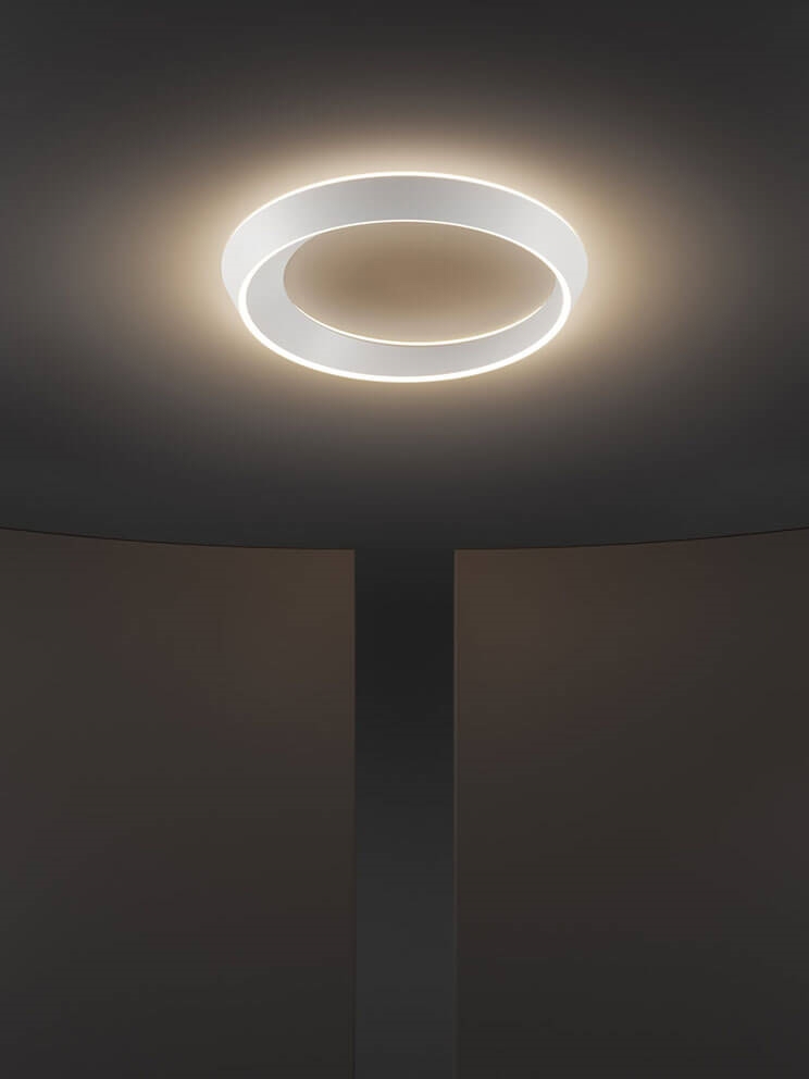 De plafondlamp Tidal bestaat uit een ring met een asymmetrische vorm geïnspireerd door de bewegingen van hemellichamen en getijden, waardoor de ene kant breder is dan de andere. Het ontwerp maakt de plafondlamp tot een visuele ervaring die er vanuit verschillende hoeken anders uitziet.