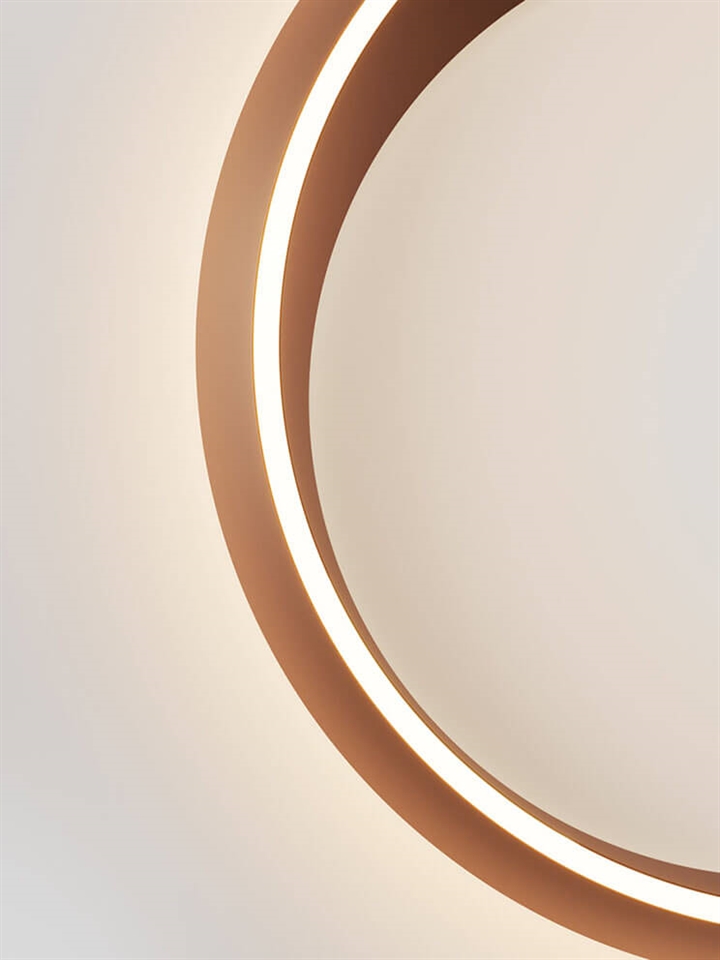 De plafondlamp Tidal bestaat uit een ring met een asymmetrische vorm geïnspireerd door de bewegingen van hemellichamen en getijden, waardoor de ene kant breder is dan de andere. Het ontwerp maakt de plafondlamp tot een visuele ervaring die er vanuit elke hoek anders uitziet.