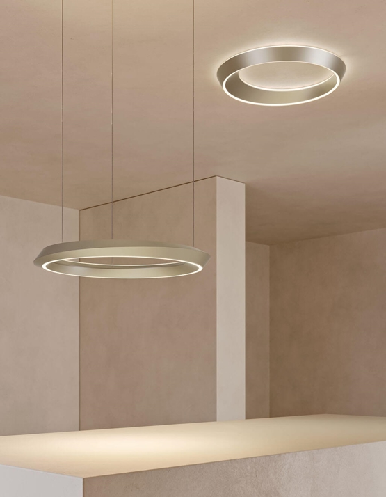 De hanglamp Tidal bestaat uit een ring met een asymmetrische vorm geïnspireerd door de bewegingen van hemellichamen en getijden, waardoor de ene kant breder is dan de andere. Het ontwerp maakt de hanglamp tot een visuele ervaring die er vanuit elke hoek anders uitziet.