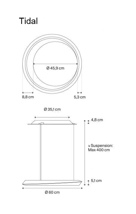 Deze variant van de hanglamp kan op een maximale hoogte van 4 meter vanaf het plafond worden gemonteerd en is verkrijgbaar in meerdere kleuren met een zwarte of witte baldakijn. Er is ook een variant die na montage een verstelbare hoogte heeft vanaf de baldakijn van maximaal 1,5 meter. Tidal is ook verkrijgbaar als plafondlamp.