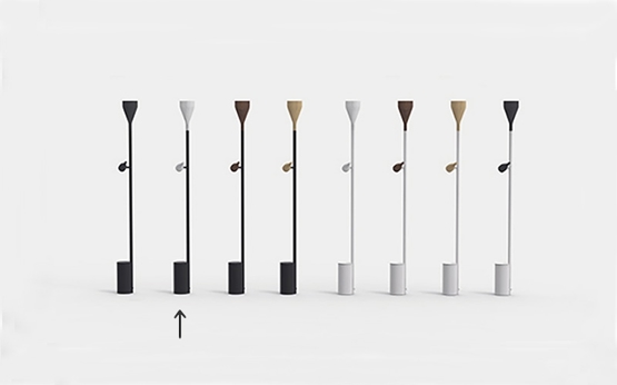 Timber Floor is naast zwart ook verkrijgbaar in wit met spot en uplight in vier verschillende varianten: eiken, walnoot, wit gebeitst essen of zwart gebeitst essen. Hier wordt Timber Floor getoond met spot en uplight in walnoot.