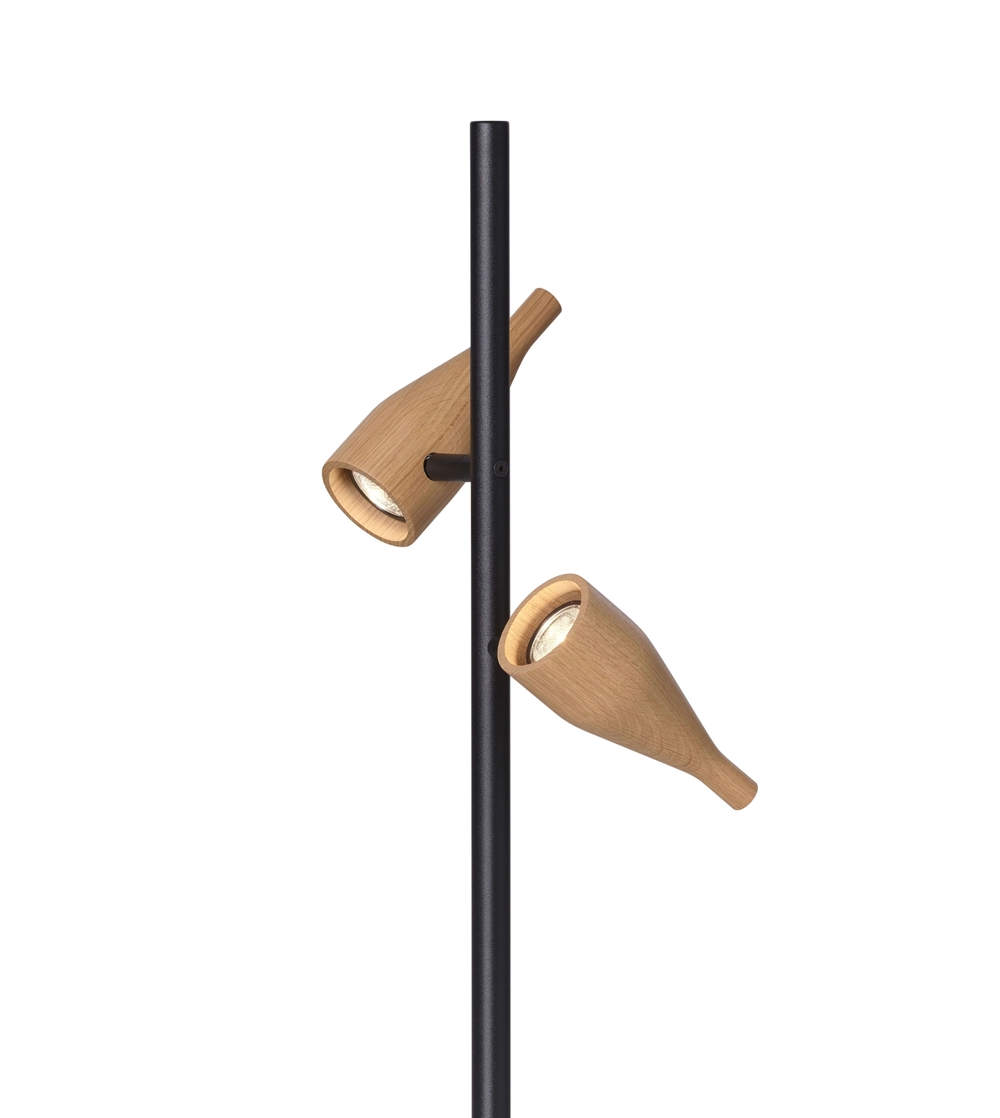Lounge Double in de Timber-serie is een vloerlamp met twee beweegbare spots, waardoor de lamp bruikbaar is als bijvoorbeeld leeslamp.