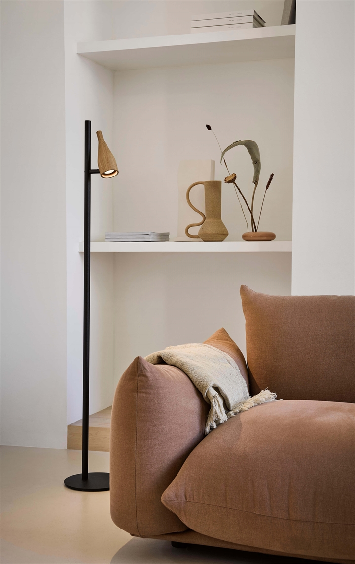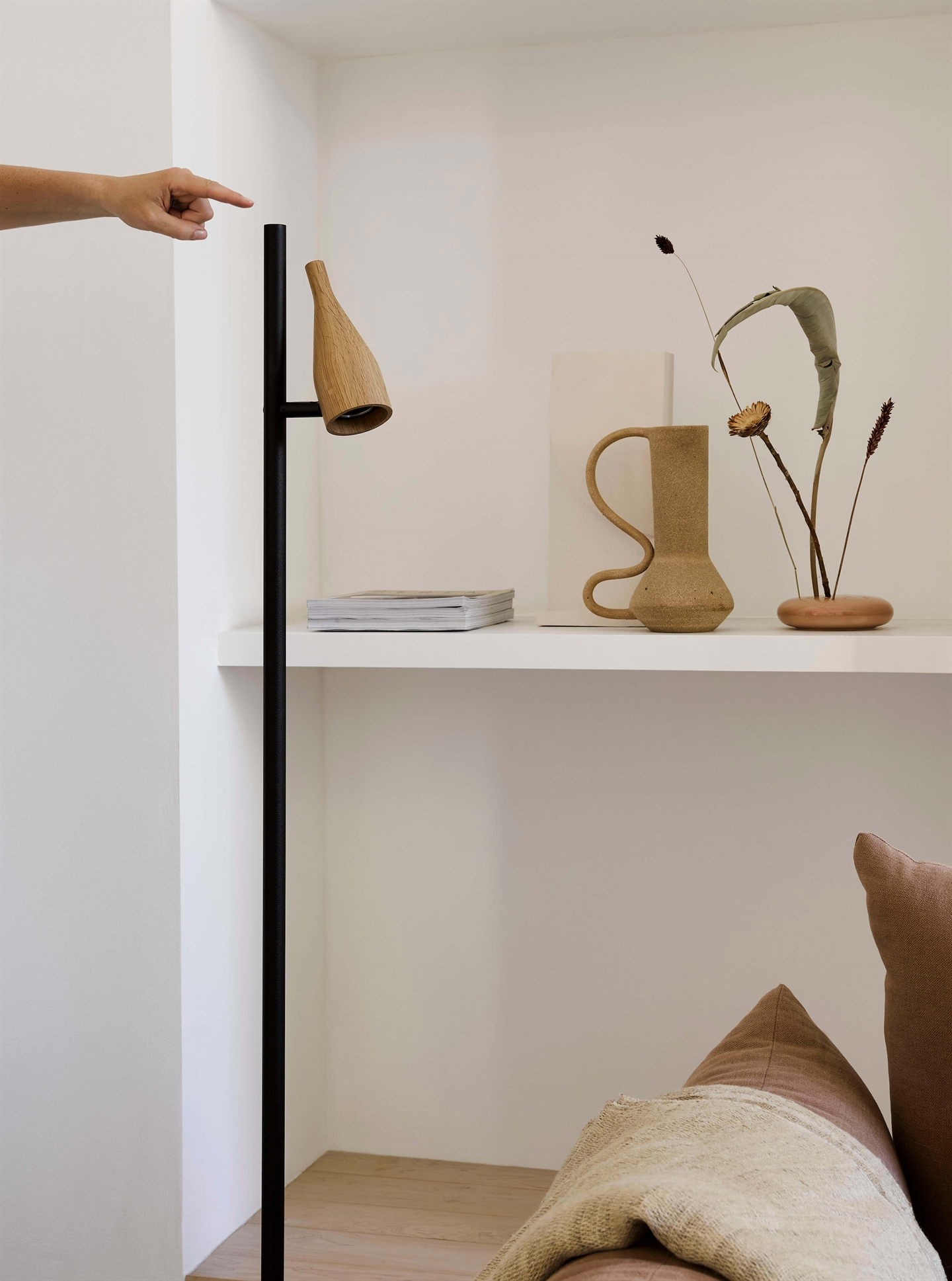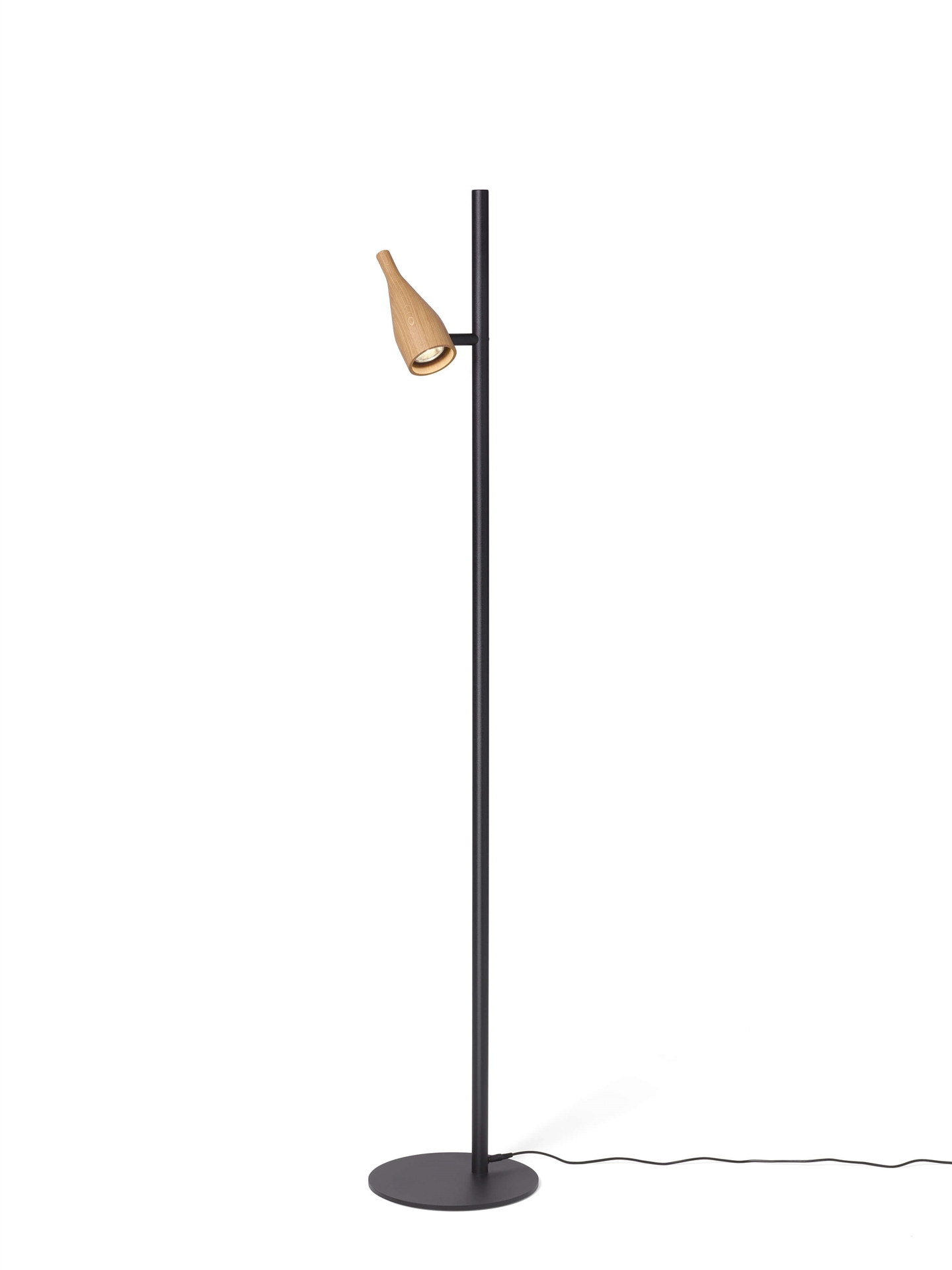 Lounge Single in de Timber-serie is een vloerlamp met één beweegbare spot, waardoor de lamp bruikbaar is als bijvoorbeeld leeslamp.