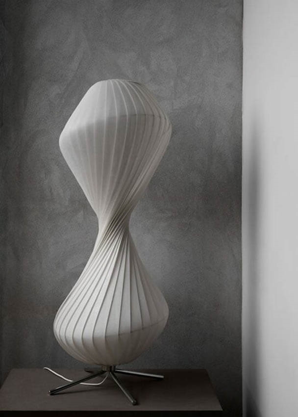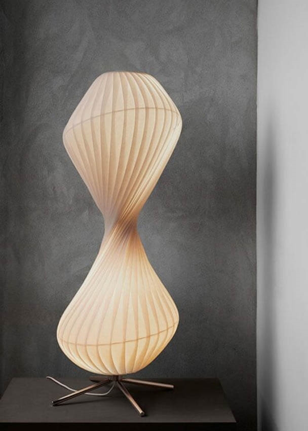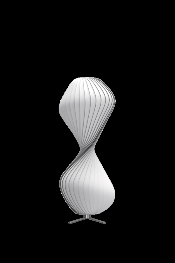 TR32 vloerlamp heeft een prachtige zandloperfiguur, waarbij de kap de lichtbronnen omsluit, waardoor het licht diffuus en zacht in de ruimte verschijnt. De mooie vloerlamp heeft een sculpturale uitstraling en is daarom ook mooi als het licht niet aan is.