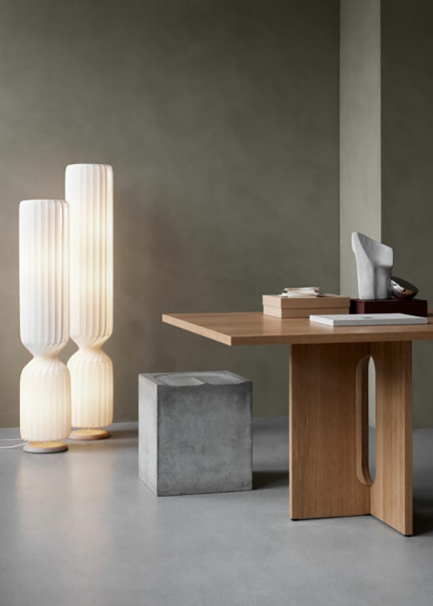De lampenkap van de hanglamp is aan de bovenkant afgewerkt met een stuk berkenhout, net zoals de vloerlamp ook op een voet van berkenhout staat, wat de scherpe sculpturale uitstraling van de serie een warme en natuurlijke touch geeft.