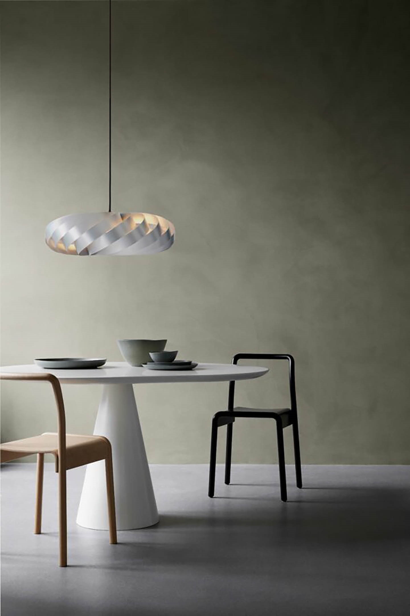 De prachtige hanglamp heeft een gedraaide vorm die het licht in alle richtingen verspreidt, maar tegelijkertijd de lichtbron afschermt. Het is daarom zowel een gezellige als functionele lamp, gemaakt van goed vakmanschap. De lamp is essentieel om boven de eet- of keukentafel te hangen en kan gemakkelijk worden gecombineerd met andere Tom Rossau hanglampen.