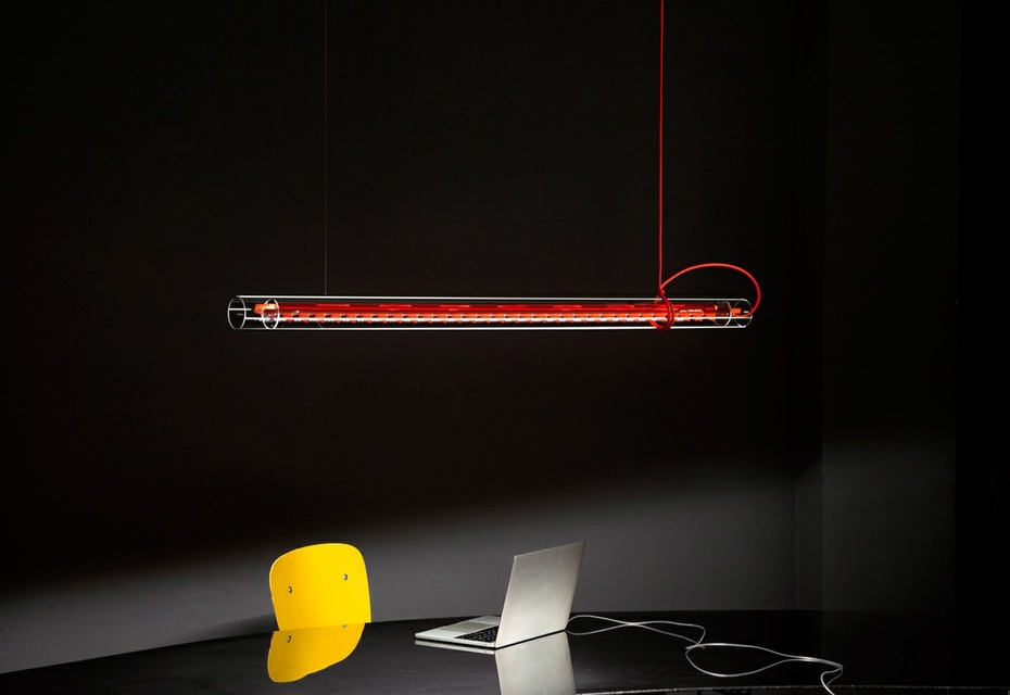 Tubular is een multifunctionele glazen armatuur. De glazen buis kan 360 graden worden gedraaid en kan worden gebruikt als downlight, uplight of wallwasher. De Tubular hanglamp is gemaakt van glas, metaal, textiel en kunststof. De hanglamp is verkrijgbaar met rode diffuser en rood snoer of met witte diffuser en blauw snoer