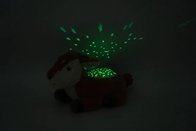 Door op de rug van het hert te drukken, gaan de lichtgevende sterren aan, die 45 minuten blijven branden en daarna automatisch uitschakelen. Kinderen kunnen zo rustig in slaap vallen.