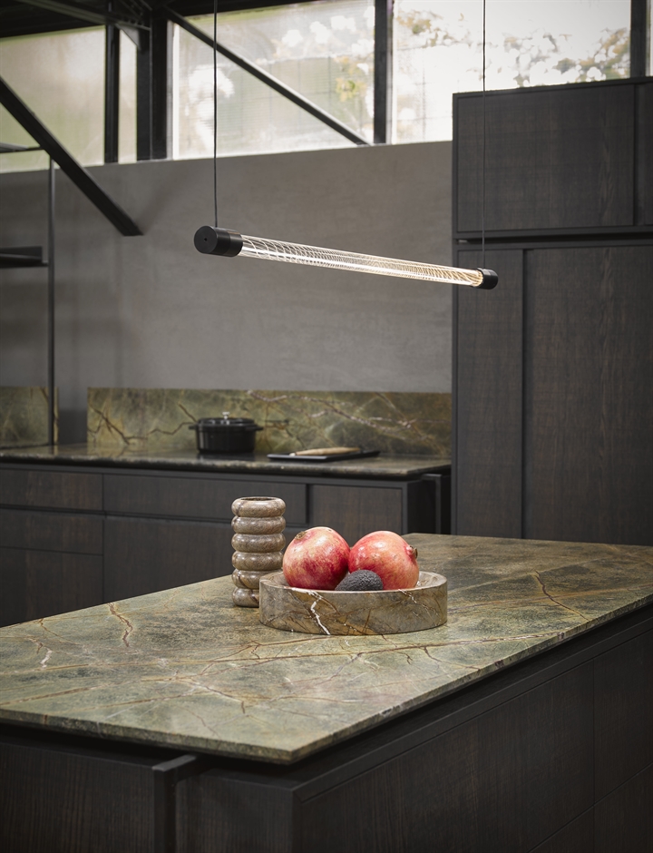 De hanglamp bestaat uit een LED-buis van geëtst glas, waardoor het licht prachtig in de ruimte wordt gebroken.