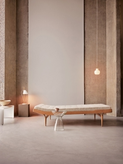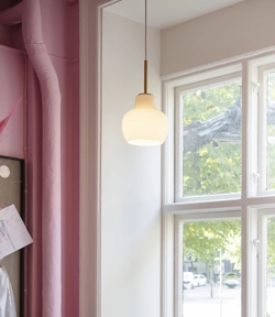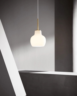 De VL Ringkrone geeft een aangenaam en warm licht dat in elk interieur past. De kap is van mondgeblazen opaal drielaags glas met ophanging en baldakijn in onbehandeld gepolijst messing, dat zal patineren. De hanglampen zijn verkrijgbaar met één, drie, vijf of zeven kappen.