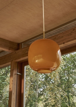 De oorspronkelijke Radiohus hanglamp werd in de jaren 1940 ontworpen voor het Radiohuis in samenwerking met Louis Poulsen. De Radiohus lamp werd in 2016 opnieuw gelanceerd als VL45 Radiohus hanglamp. Deze amber variant is geïntroduceerd in 2025 en heeft een top van messing en een gekleurde kap van vierlaags glas met een glanzende buitenkant en een glanzend witte binnenkant.