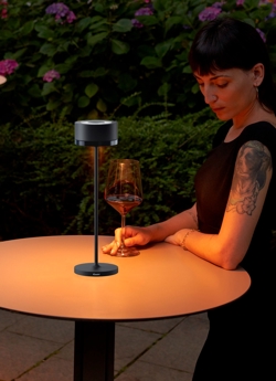 De elegante tafellamp is geschikt voor buitengebruik dankzij IP-klasse 65, en een oplaadbasis met kabel en USB-poort is inbegrepen in het pakket, zodat je de lamp eenvoudig kunt opladen.