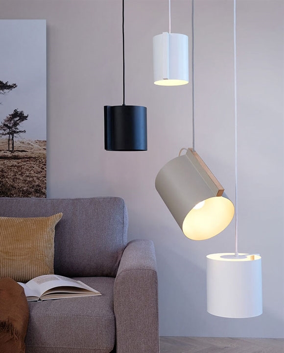 De hanglamp is verkrijgbaar in twee maten en de kleuren mat zwart en warm wit. Hij is ook verkrijgbaar in een schuine variant in de kleur mat grijs.