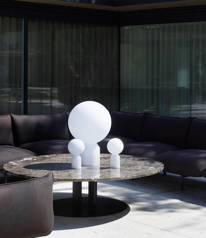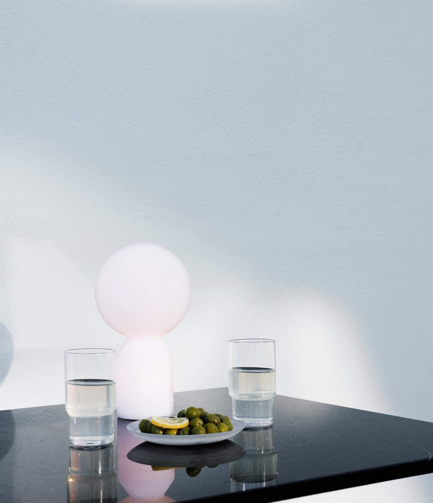 De oplaadbare Yo lamp combineert een sculpturaal ontwerp met praktische functionaliteit als draagbare batterijlamp. Yo is gemakkelijk mee te nemen en kan zowel binnen als buiten worden gebruikt, waar de cilindrische basis en bolvormige kap een opvallend element zullen zijn in elke ruimte of op het terras.